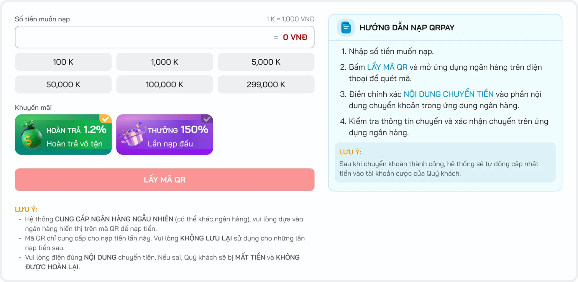 - Hệ thống cung cấp ngân hàng ngẫu nhiên (có thể khác ngân hàng), vui lòng dựa vào ngân hàng hiển thị trên mã QR để nạp tiền.